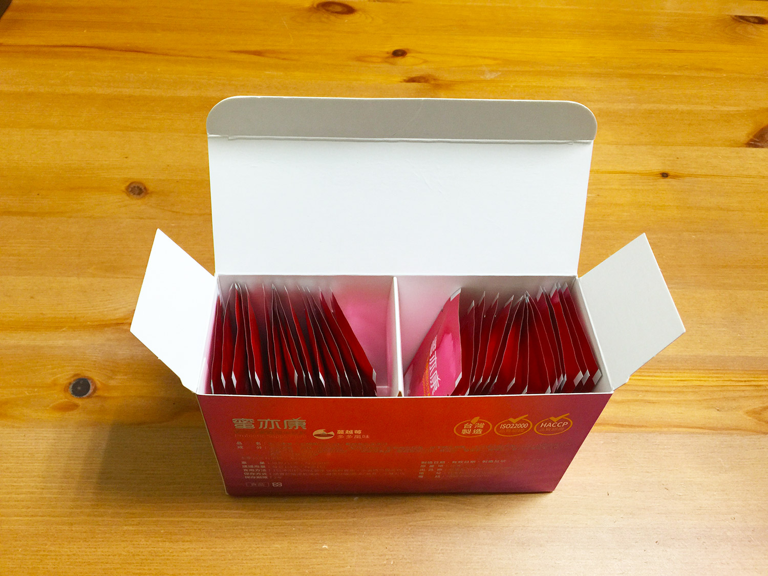 把外面的透明膜撕開以後,裡面就是30包長形的鋁箔包了,是帶櫻桃色的包裝,美!